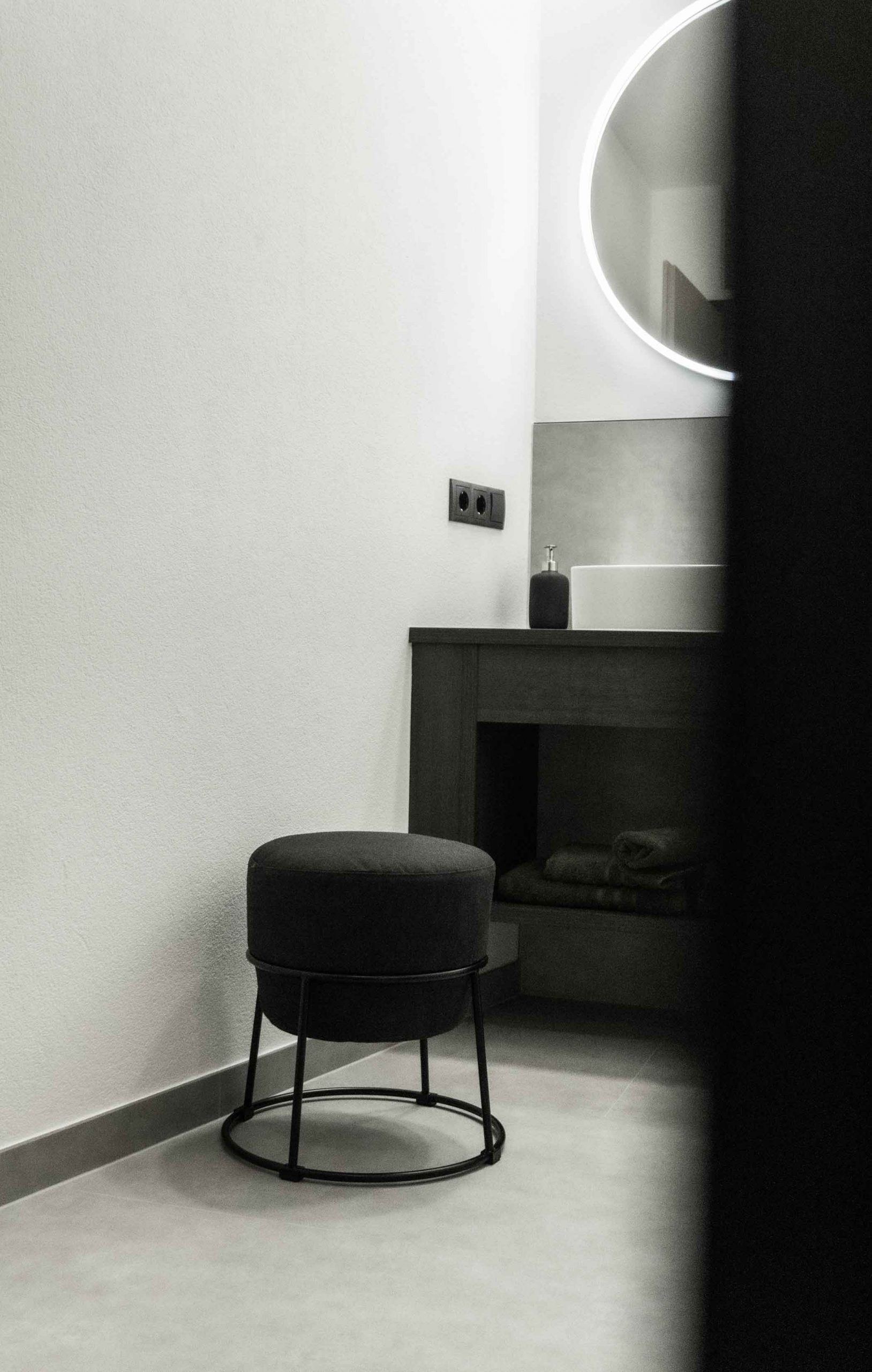 Walk-in Regendusche, WC, Waschbecken, beleuchtete Spiegel